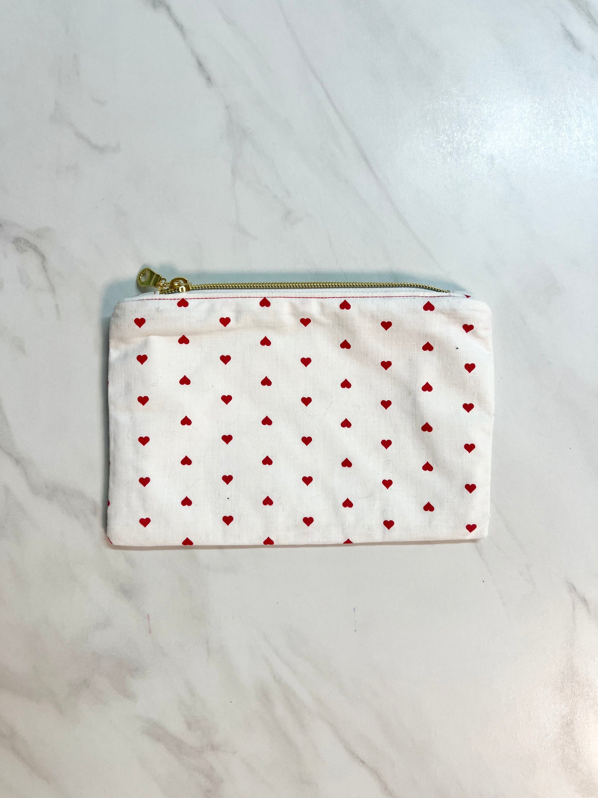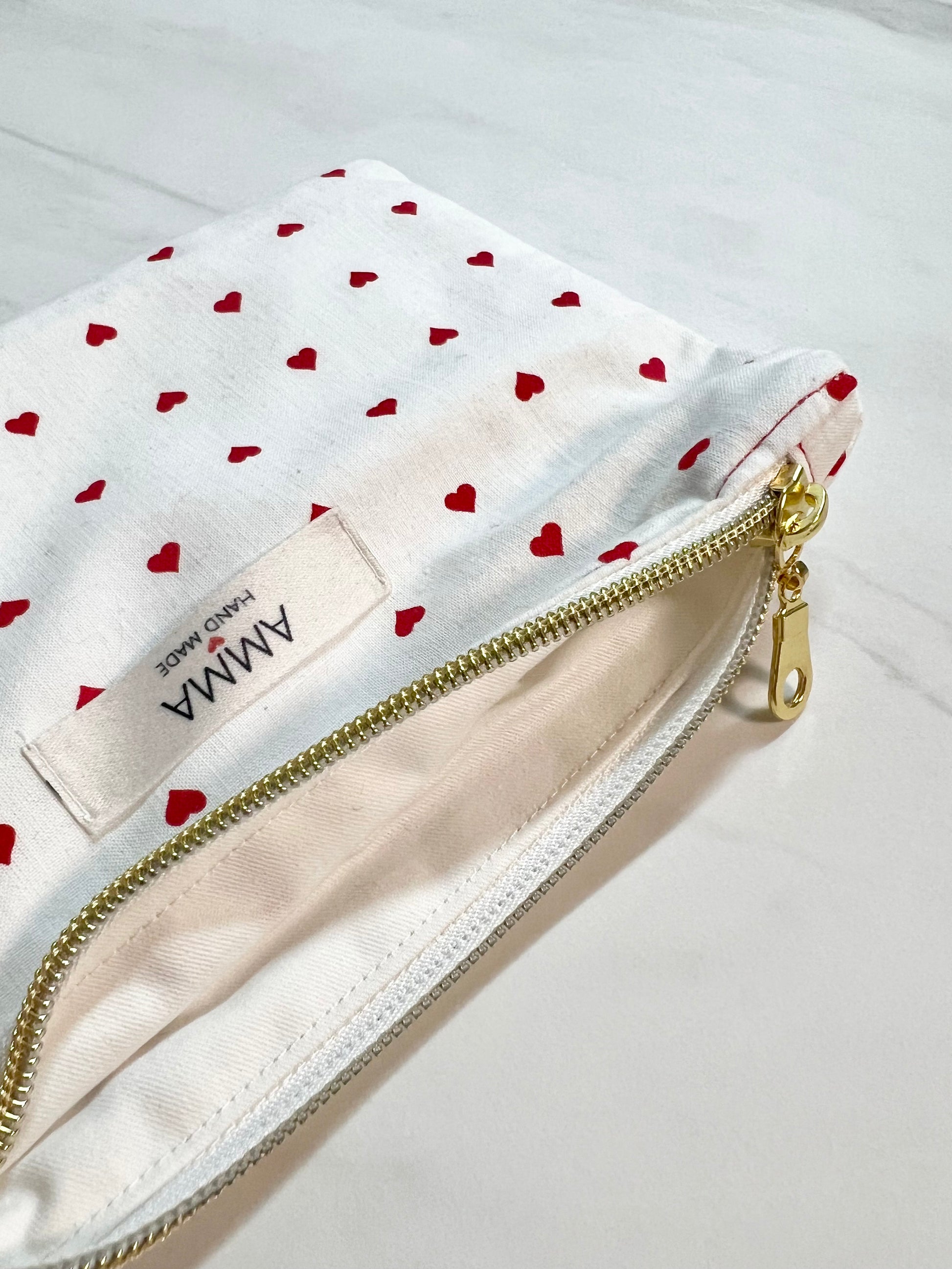 Notre petite pochette Coeurs en coton est l'accessoire indispensable pour transporter vos petites affaires (passeport, clés, écouteurs, cartes...)